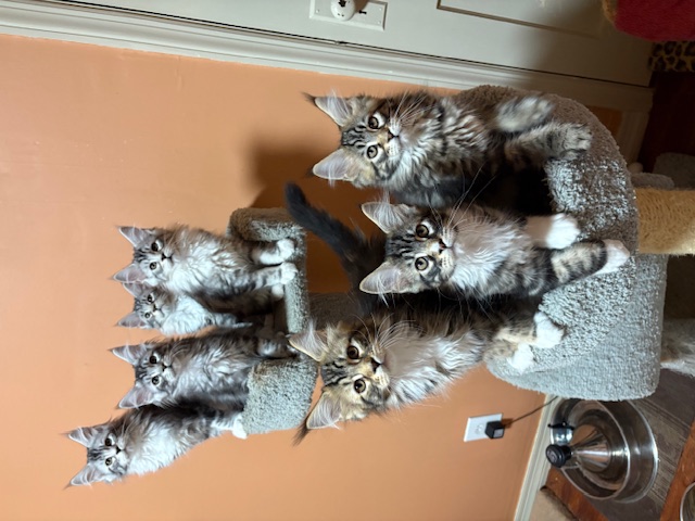 We specialize in brown classic tabbies with and without white, and both hi and low whites. We also get brown patched tabbies with & w/o white, red tabbies with and w/o white, silver tabbies with & w/o white as well as black & white. Our cattery is our home. None of our kittens are ever caged. All of our babies are given lots of love and attention and are handled on a daily basis. We breed our cats to have good health, size, temperarment and lots and lots of personality. Our kittens are well socialized when it comes time to leave us.